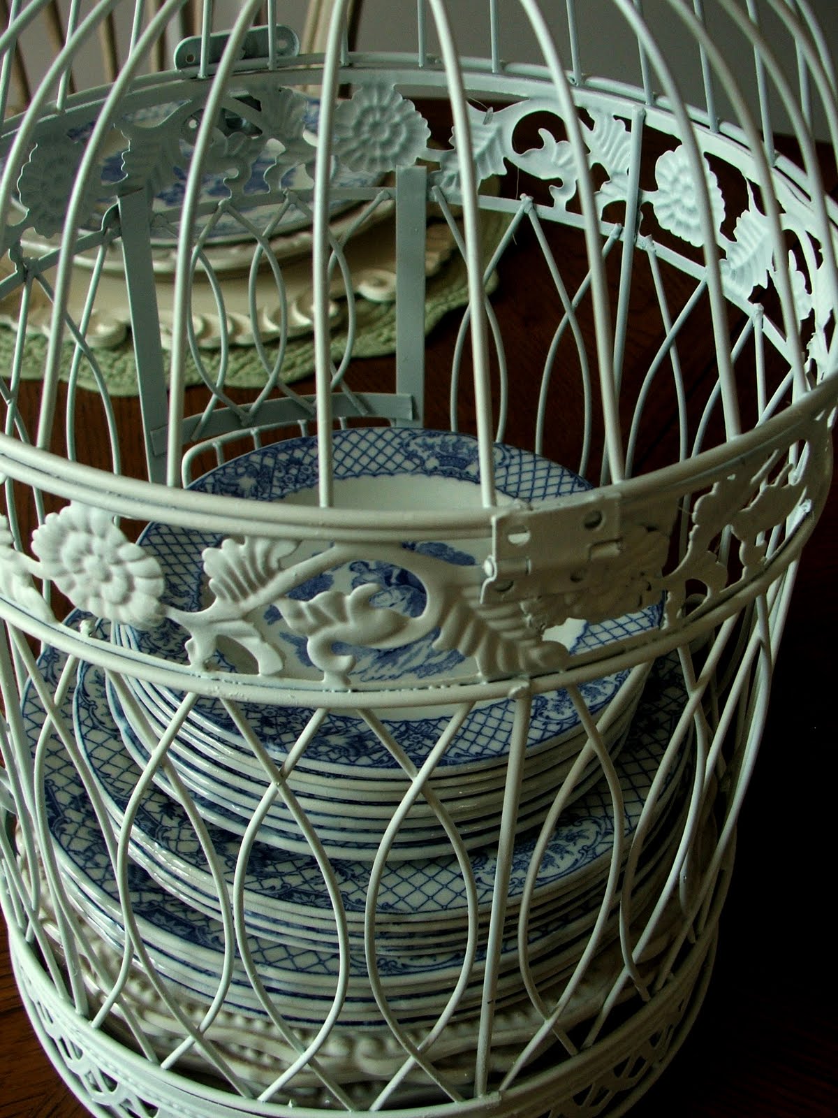 The birdcage holding the transferware plates is so charming, what a wonderful idea.