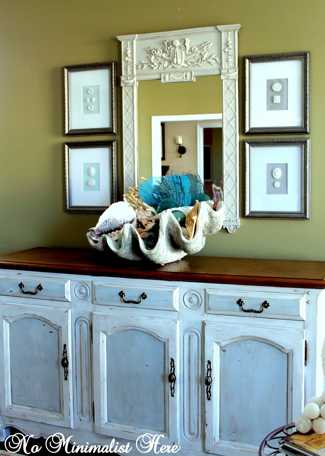 Looks great! I have a fake one from Pottery Barn that I got 3 years ago and I just love it. Yours looks great on that wonderful sideboard! Unfortunately I don't use mine too often because it is so large and the space at my beach house is limited…I always thought it would be fun to serve some type of food in or on…I think shells make everyone happy because they remind people of the beach and relaxation!